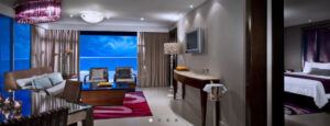 Highlights include Double hydro spa tub in room. Amenities include: Private terrace, Double size sofa bed, Rock Spa® bath amenities, Digital safe (laptop size), Nespresso coffee machine with capsules, Hair blow dryer, Digital scale (on request), Iron/ironing board, Exclusive beach bag, Complimentary 25-minute couple’s massage at the Rock Spa® (one per stay), Ironing Service (2 items per person/per stay)